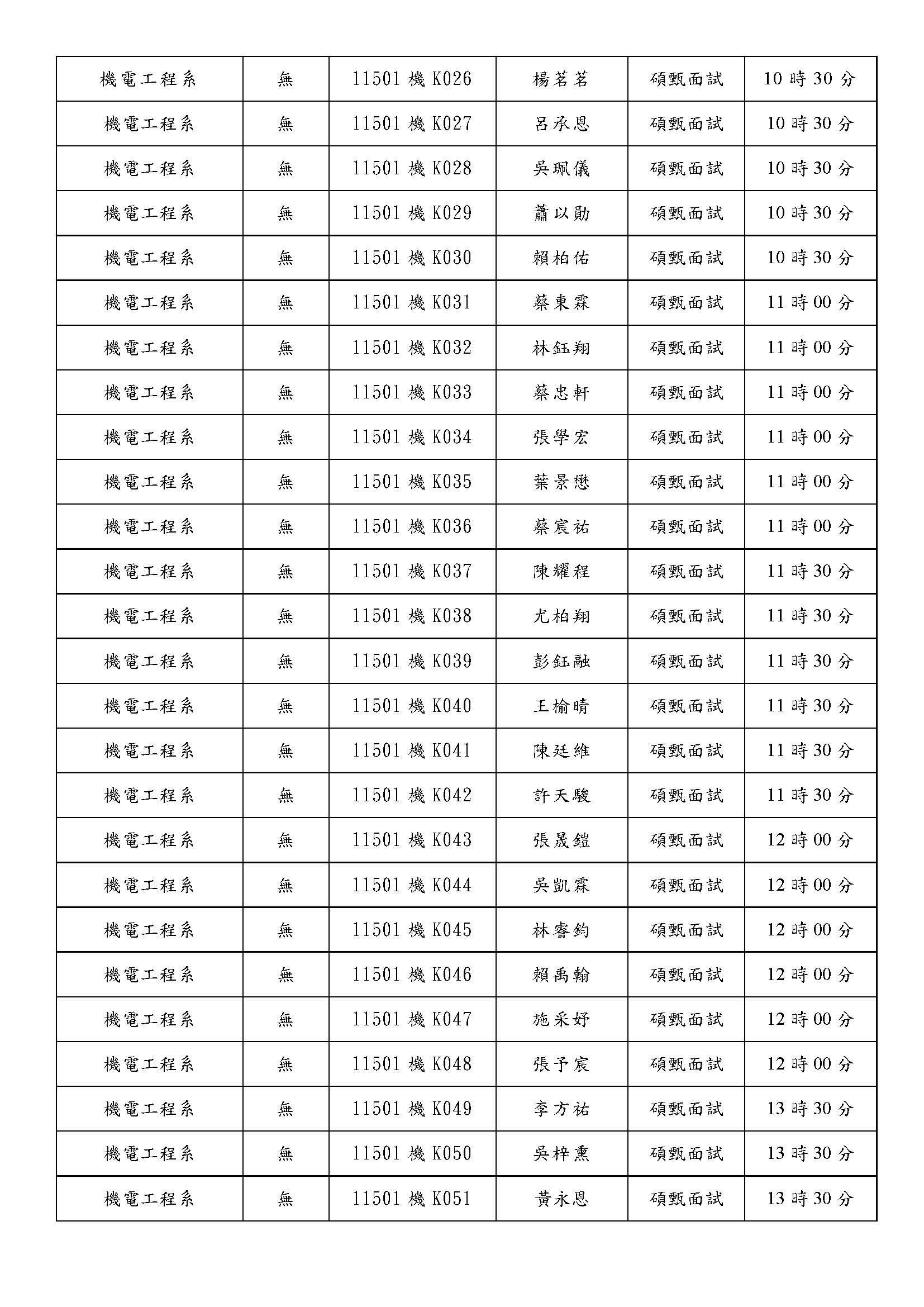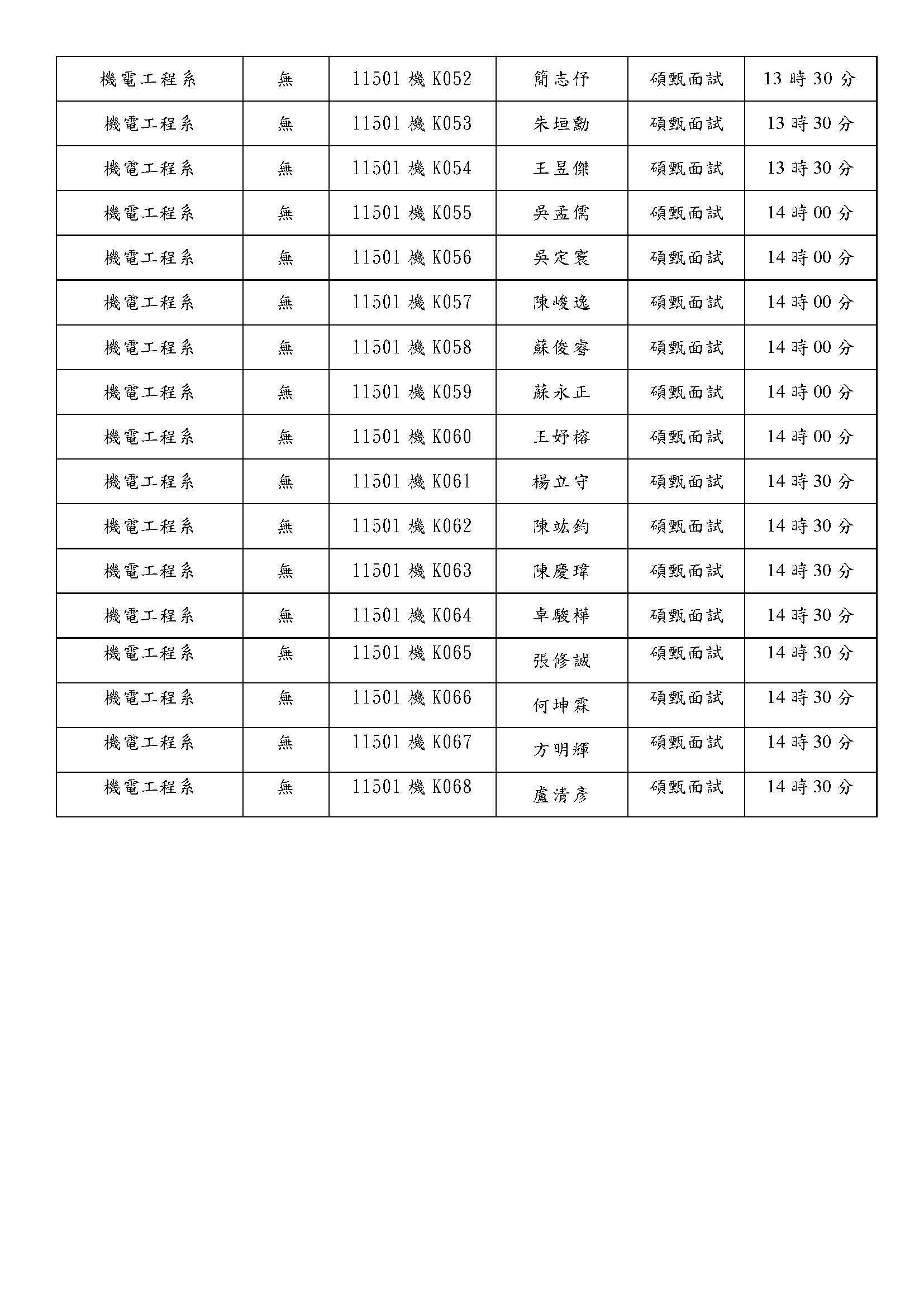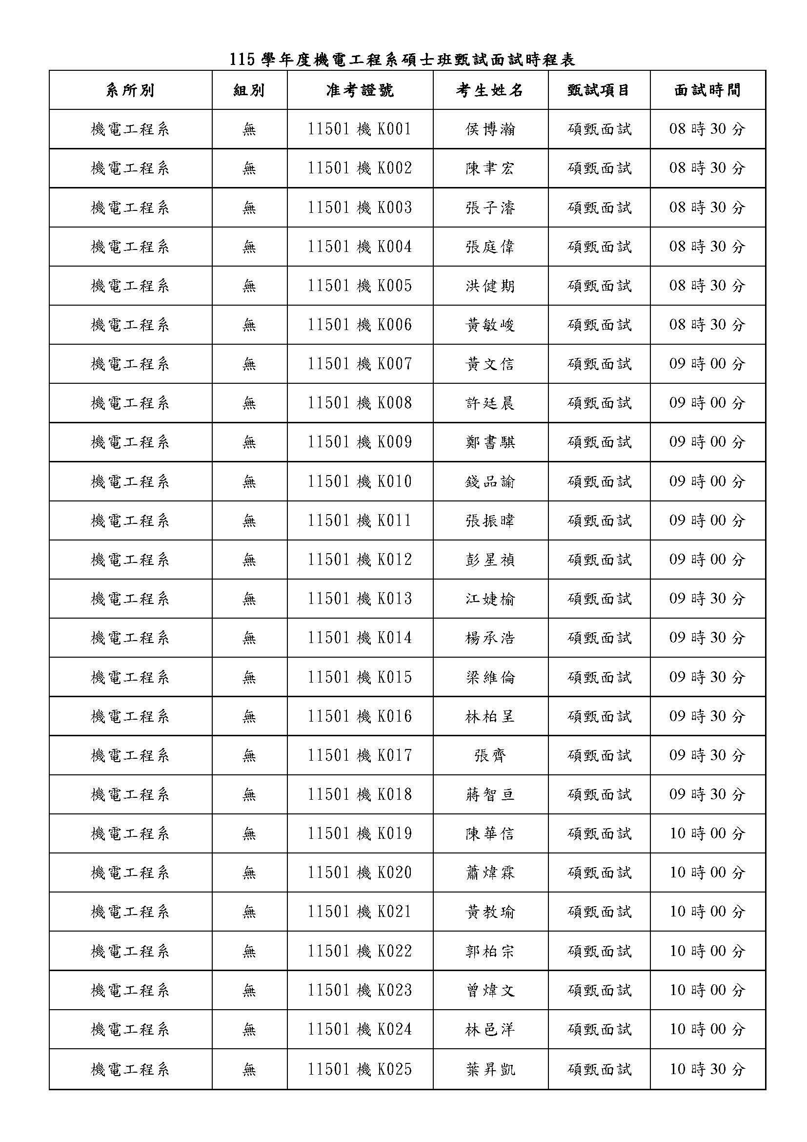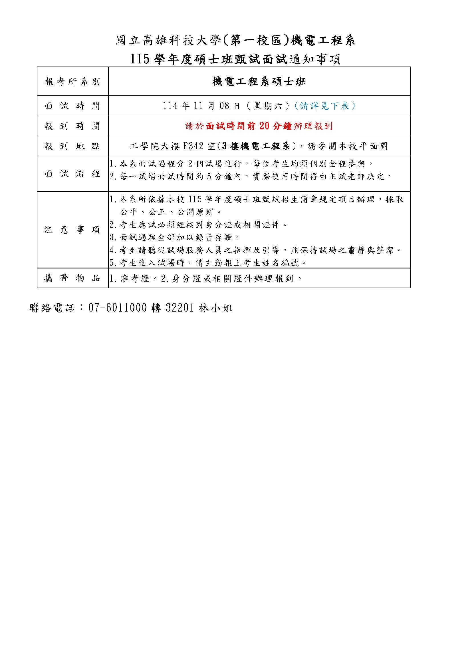 公告115學年度機電工程系碩士班甄試面試通知及時程表